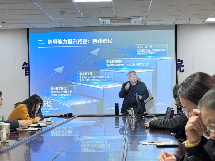 活动中,张顺堂以“党建引领下MEM导师的使命与能力建设”为主题,系统阐述了新时代工程管理专业导师的核心素养。他强调,党员导师要牢记为党育人、为国育才的初心使命,将思想政治教育贯穿指导学生全过程,培养学生成为兼具专业能力与家国情怀的工程管理人才。