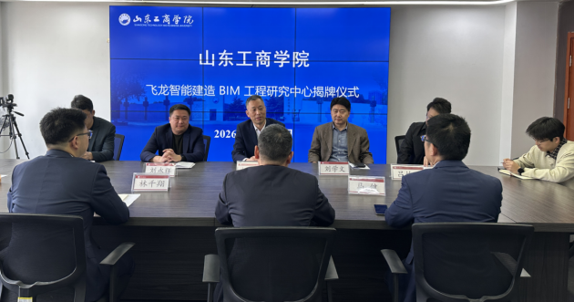 为深化产教融合、推动智能建造领域产学研协同创新,2026 年 4 月 15 日上午 8:30,山东工商学院与飞龙集团共建的“飞龙智能建造BIM 工程研究中心”揭牌仪式,在我校 6707 会议室隆重举行。此次仪式标志着我校在智能建造与 BIM 技术融合创新领域迈出关键一步,为校企协同攻关、服务区域建筑产业数字化转型搭建了坚实平台。