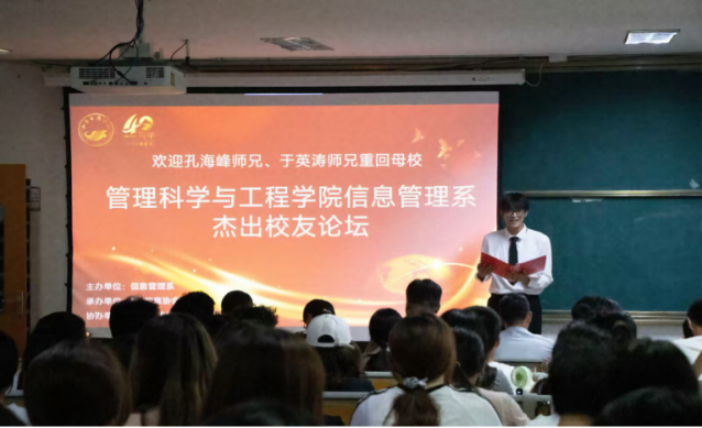 9月26日,在学校建校40周年之际,由学院信息管理系主办,格e信息协会承办,电脑技术协会协办的杰出校友论坛于第三教学楼举办。论坛特别邀请信息95级校友、电脑技术协会创始人之一、猎豹移动资深AI专家孔海峰,学院党委副书记、院长杨永清,信息管理系老师及信息管理系的全体学生共同参与。
