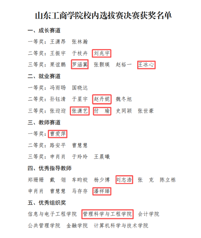 12月14日,由学校招生就业处主办,管理科学与工程学院承办,管理科学与工程学院学生会与职业发展协会协办的第三届全国大学生职业规划大赛校内选拔赛决赛在大学生艺术中心礼堂落下帷幕。学院师生凭借扎实的专业积淀与出色的现场表现,在众多参赛选手中脱颖而出,斩获荣誉。管理科学与工程学院荣获“优秀组织奖”;曹爱萍老师荣获教师赛道一等奖;刘兆宇、罗涵翼、王冰心同学分别荣获成长赛道二等奖1项、三等奖2项;赵丹妮、张潇艺、付瑜同学分别荣获就业赛道二等奖1项、三等奖2项;刘志浩、潘祥臻老师荣获“优秀指导教师”荣誉称号。