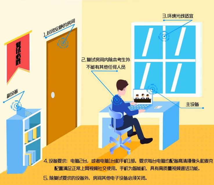 本次复试采用中国研究生招生信息网(以下简称“研招网”)网络面试系统,并选用腾讯会议作为备选复试平台。请考生复试前务必找一个网络流畅、安静、整洁、明亮、封闭、无外人干扰的房间,提前调试好“双机位”线上复试设备(包括电脑、摄像头、话筒、手机、手机支架等),周边无任何与考试有关的书面或电子材料。具体操作见附件1-3。